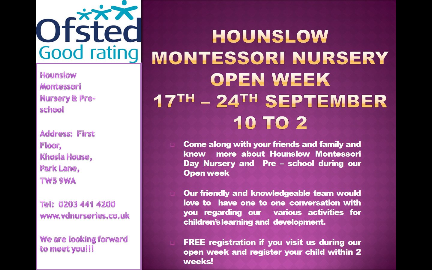 Open Week at Hounslow Montessori Nursery and Pre-school from 17th to 24th September; 10 to 12