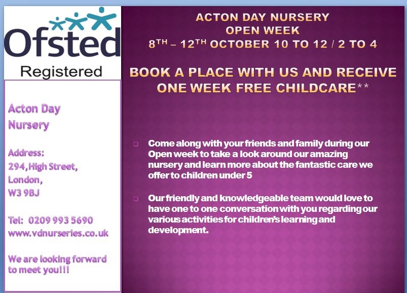 September 21, 2018Acton Day Nursery Open week 8th – 12th OCTOBER 10 to 12 / 2 TO 4 Book a place with us and receive one week free childcare** Come along with your friends and family during our Open ...
