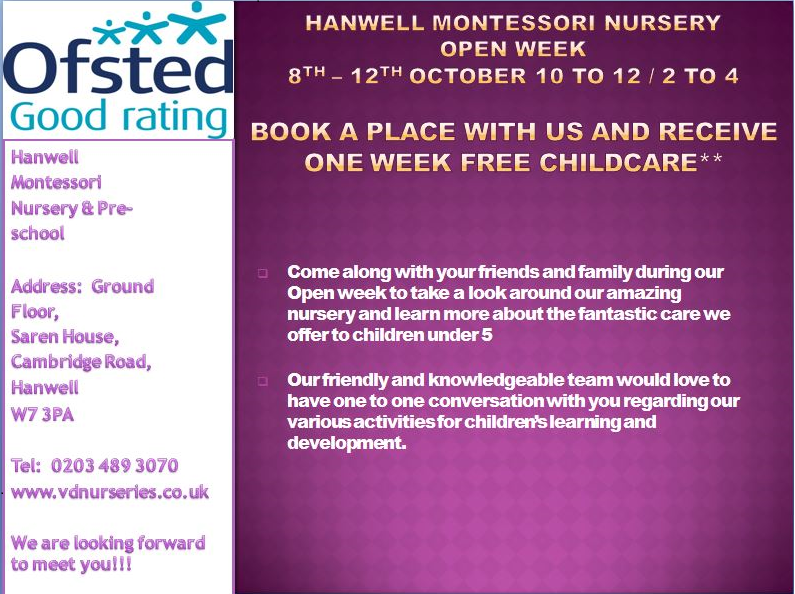 September 21, 2018Hanwell Montessori Nursery Open week 8th – 12th October 10 to 12 / 2 TO 4 Book a place with us and receive one week free childcare** Come along with your friends and family duri ...