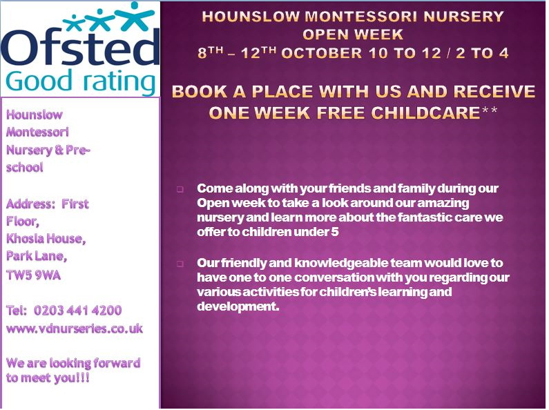 September 18, 2018Come along with your friends and family and know more about Hounslow Montessori Day Nursery and Pre – school during our Open week 17th to 24th September; 10 to 12 Our friendly and kn ...
